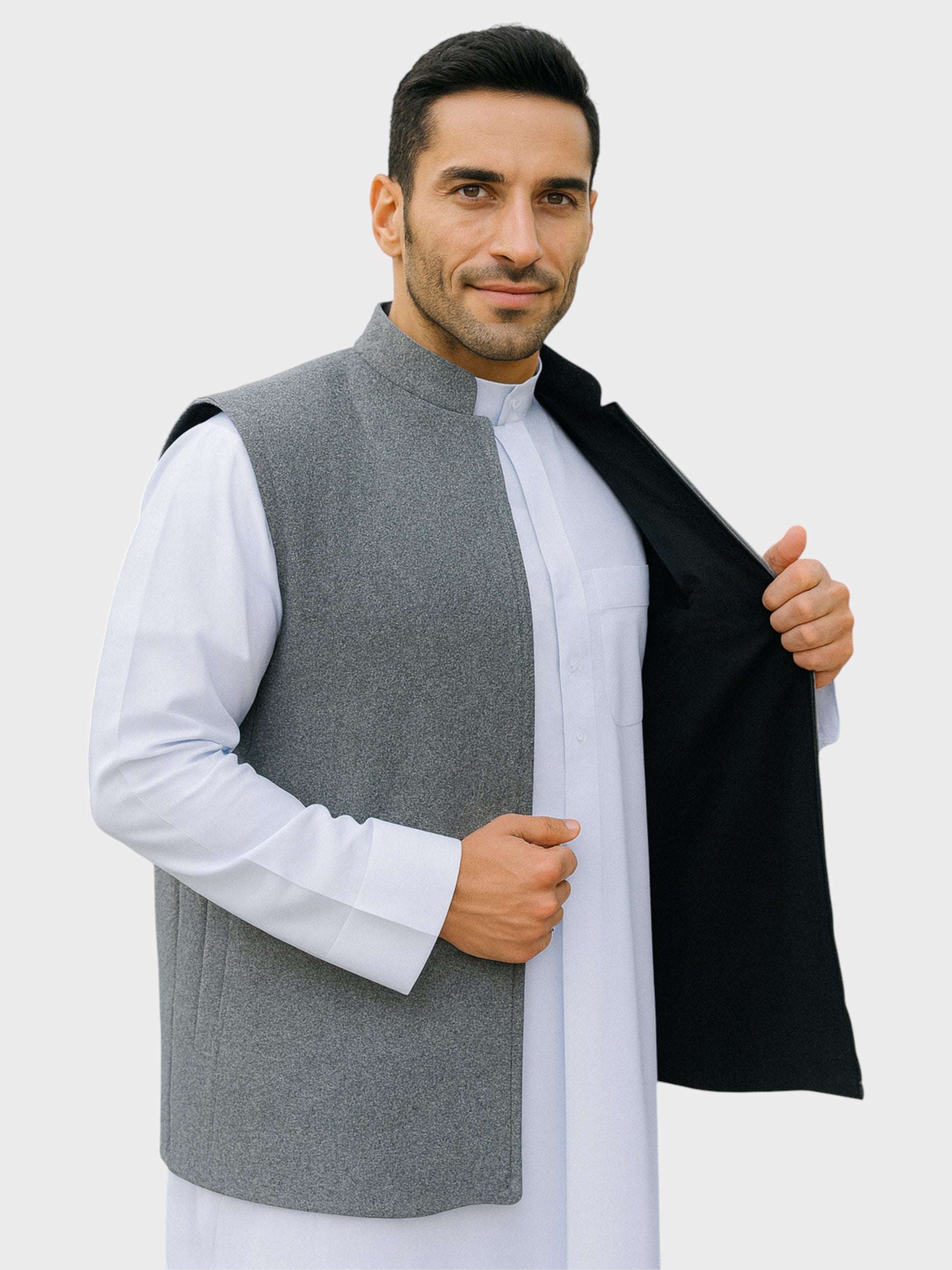 Premium Kashmiri cardigan with reversible design offering exceptional warmth for cold days. Crafted from fine Kashmiri wool with superior quality and comfort. Authentic Kuwaiti-made piece reflecting expert craftsmanship. Choose between classic grey or elegant black for versatile styling options.
